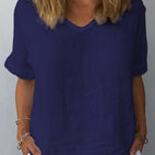 Unser lockeres Top aus Baumwolle und Leinen für Damen ist die ideale Ergänzung Ihrer Alltagskleidung und vereint Bequemlichkeit und Vielseitigkeit. Gefertigt aus einer weichen und luftdurchlässigen Mischung, bietet dieses Top eine gemütliche Passform, die Bewegungsfreiheit erlaubt und für Frische und Eleganz sorgt. Tragen Sie es zu Shorts oder Jeans für einen entspannten Look, perfekt für jeden informellen Anlass.