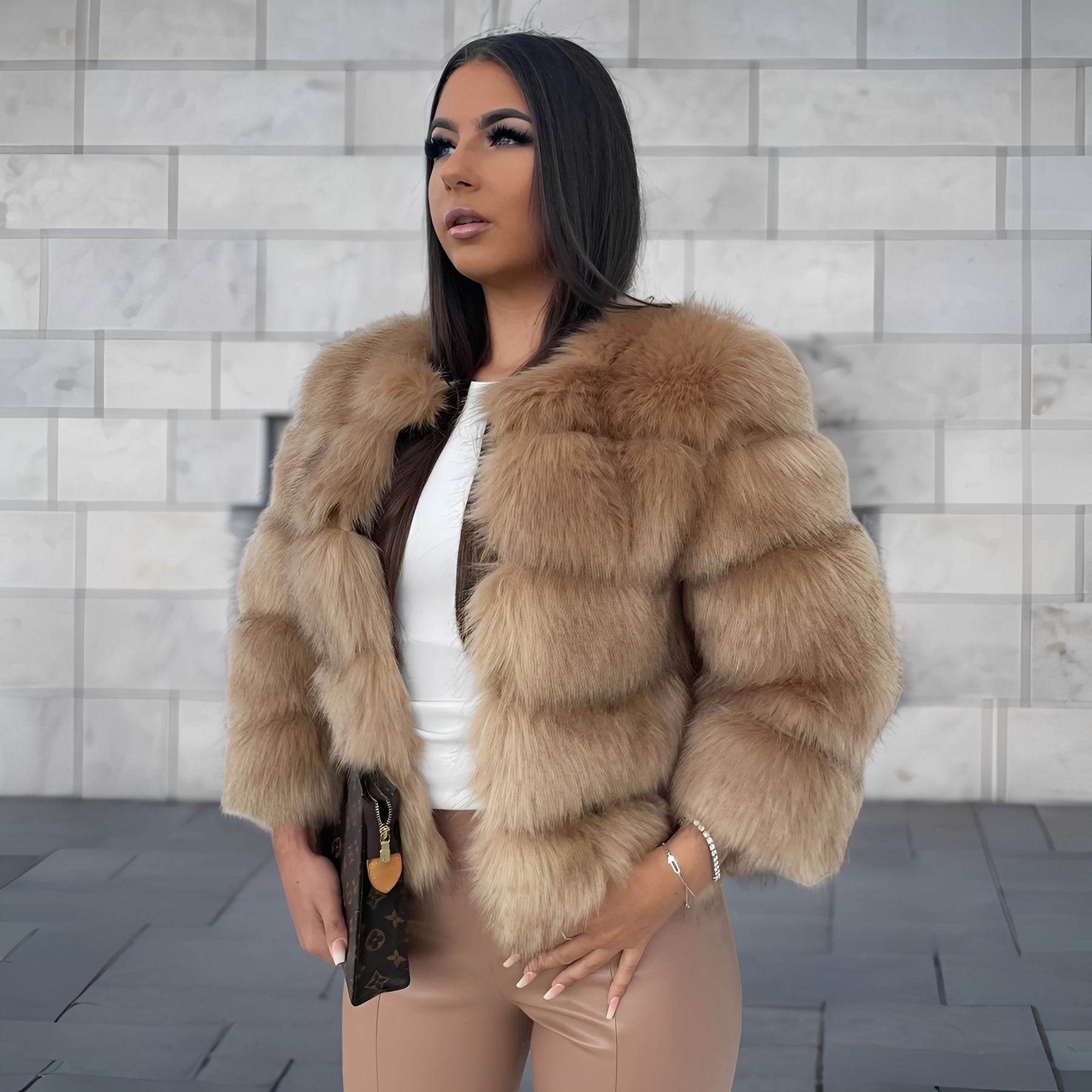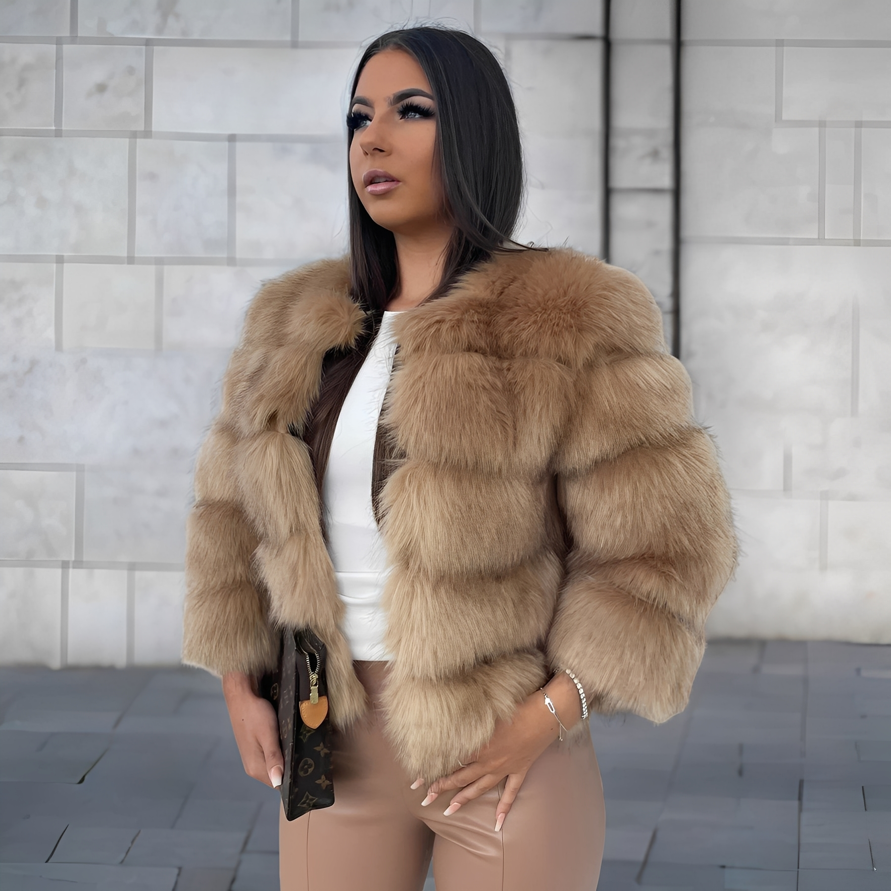 Dieser stilvolle Mantel für Damen aus feinem Kunstfell bietet einen eleganten, sanften Look und hervorragende Wärme. Der weiche Stoff fühlt sich angenehm auf der Haut an und ist ideal für kalte Wintertage. Der kurze, moderne Schnitt ist vielseitig kombinierbar – ideal für den Alltag, Abendveranstaltungen oder spezielle Anlässe. Leicht zu pflegen, bequem und ein echter Blickfang in jeder Wintergarderobe.
