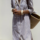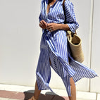 Genießen Sie das klassische gestreifte Amélie-Kleid, das entwickelt wurde, um Stil und Komfort perfekt zu kombinieren. Der lockere Schnitt und die zeitlosen Details sorgen für eine vorteilhafte Form und bieten gleichzeitig viel Bewegungsfreiheit. Ideal für die Arbeit, einen Brunch oder einen entspannten Ausflug, bietet dieses Kleid täglich Stil und Komfort. Es ist aus einem hochwertigen, atmungsaktiven Stoff gefertigt, der sich angenehm auf der Haut anfühlt und einfach zu pflegen ist. Mit dem klassischen Kragen und dem vielseitigen asymmetrischen Saum ist es zu jeder Tageszeit geeignet.