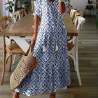 Entdecken Sie den Charme dieses langen, stilvollen Boho-Kleides, hergestellt aus einem weichen, atmungsaktiven Material für den ganzen Tag über besten Komfort. Der romantische V-Ausschnitt und die elegante Silhouette verleihen dem Kleid einen femininen und ungebundenen Stil, ideal sowohl für den Alltag als auch für besondere Anlässe. Mit seinem lockeren Schnitt und der leichten Textur schmeichelt es jeder Figur. Sein lässiger, aber eleganter Stil macht es zur perfekten Wahl für alle, die Boho-Chic mit einer Note von Eleganz genießen. Kombinieren Sie es mit Sandalen für einen entspannten Look oder mit hohen Schuhen und Schmuck für einen Abendauftritt.
