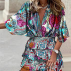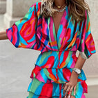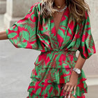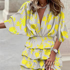 Damenkleid – V-Ausschnitt – Blumenmuster – Volants – Fledermausärmel – Elastischer Bund: Entdecken Sie dieses elegante Kleid mit einem wunderschönen Blumenmuster, einem schmeichelhaften V-Ausschnitt, verspielten Volants und bequemen Fledermausärmeln.
