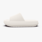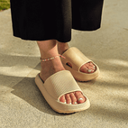 Der erhöhte Absatz (≈15°) unterstützt die Haltung und beruhigt das Fußgewölbe. Die extra weichen Riemen schmiegen sich um den Fuß, während die Sohlentextur bei jedem Schritt sanft massiert.