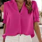 Die Sophia – Bluse mit V-Halsausschnitt und kurzen Ärmeln ist die ideale Ergänzung für Ihre Garderobe, um ein stilvolles und vielseitiges Kleidungsstück hinzuzufügen. Sie ist aus hochwertigem Chiffon und Polyester gefertigt und bietet Komfort, Atmungsaktivität und Eleganz. Ihr lockerer Schnitt und durchdachtes Design machen sie perfekt fürs Büro und für entspannte Anlässe. Ein praktisches und trendiges Muss, das das ganze Jahr passt.